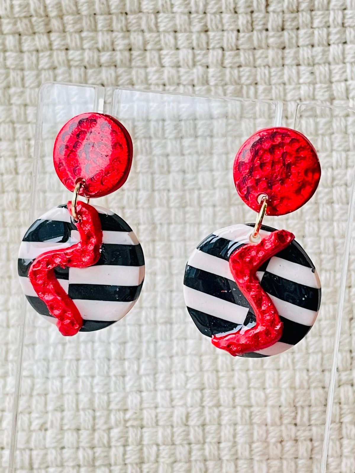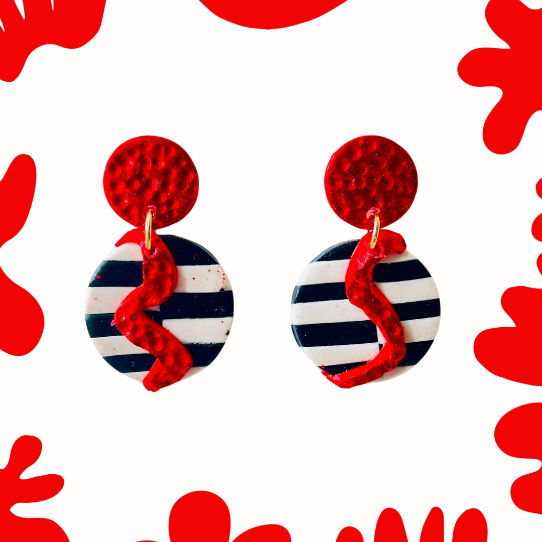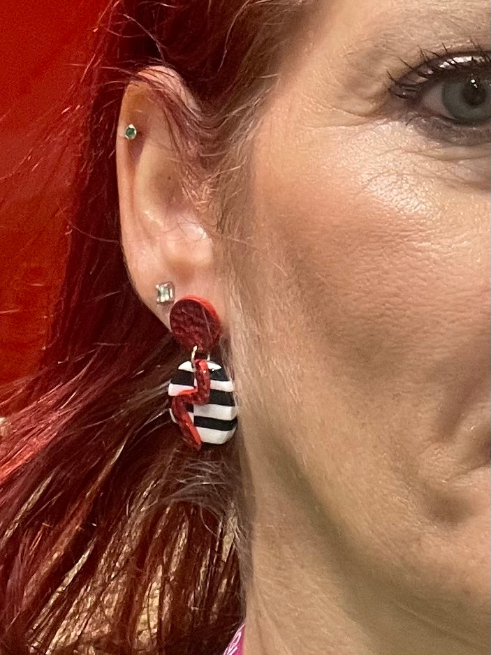 Fun and colorful, these small statement earrings will add a touch of fire to any outfit! A bright red lightning bolt shines on top of the black and white background. The red clay has been covered with gold foil and hammered to give a different texture.
